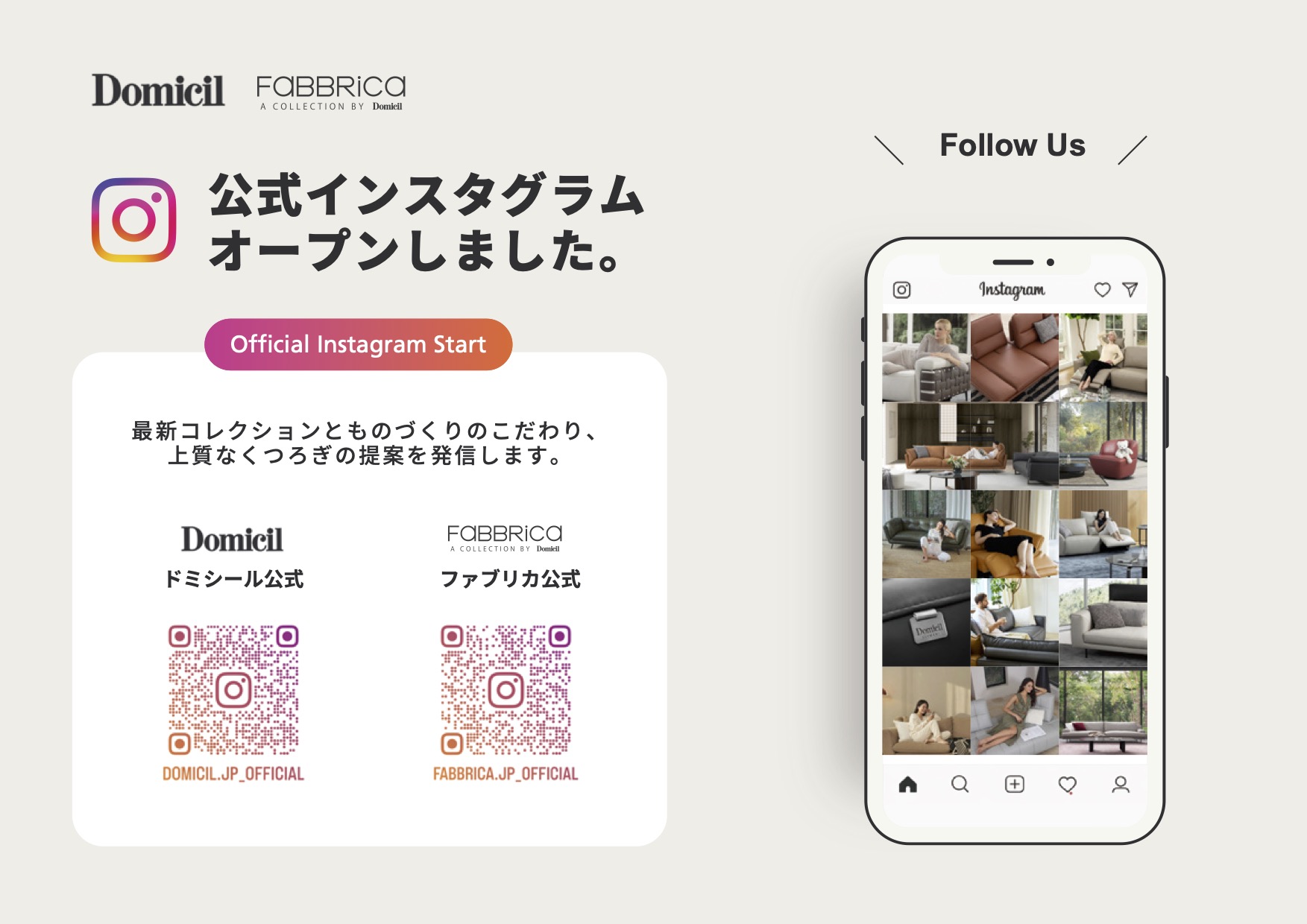 Domicil / FaBBRica 公式Instagramをスタートしました。